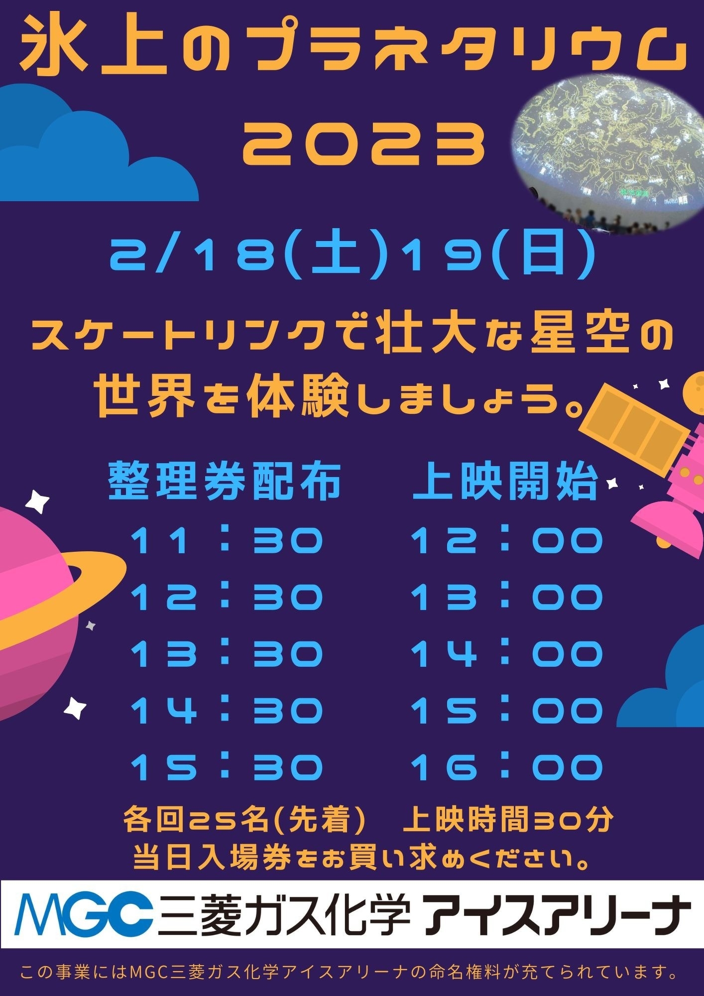 好評につき氷上のプラネタリウム開催決定! 2023年02月09日(木) 昨年開催の「氷上のプラネタリウム」が帰ってきた! 2月18日(土)、19日(日)の二日間に前回好評いただいた氷上プラネタリウムを開催致します。 ドーム内に映し出された宇宙の姿は、みなさんを幻想空間へと誘います。 スケートリンクで壮大な星空の世界をご体感ください! 皆さまのご来場、お待ちしております!