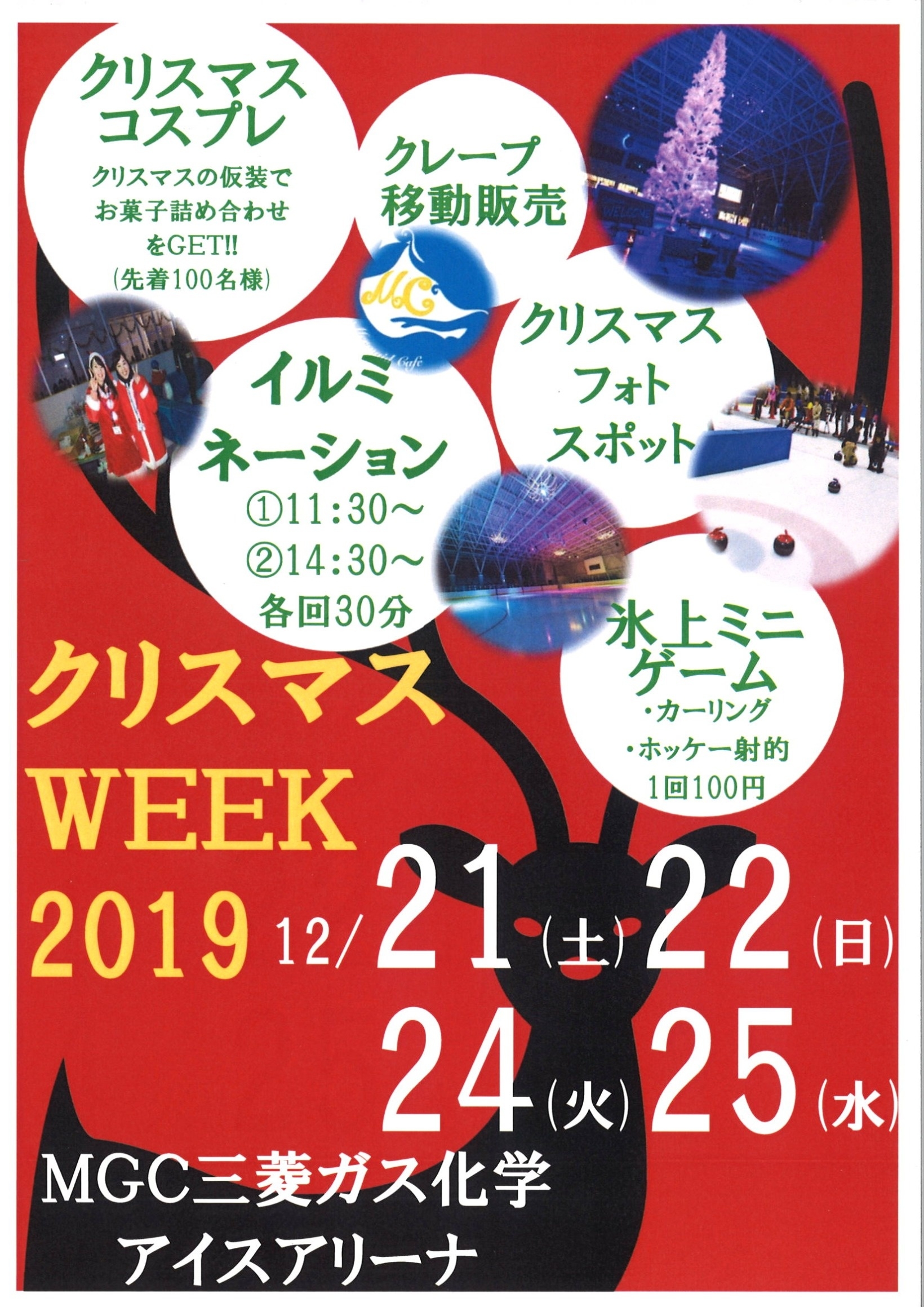 12月イベント情報 2019年11月18日(月) イベント ★クリスマスWEEK★ 12月21日(土)・22日(日)・24日(火)・25日(水)の4日間 ①11:30~12:00 ②14:30~15:00 に氷上を鮮やかに彩るクリスマスイルミネーションを行います!! その他にもカーリングやホッケーを体験できるミニゲーム(10:00~12:00)や おいしいクレープの移動販売などもございます!! また、クリスマスの衣装で来場の方にはお菓子をプレゼントいたします!!(先着100名様) この機会に是非、氷上スポーツをお楽しみ下さい!!