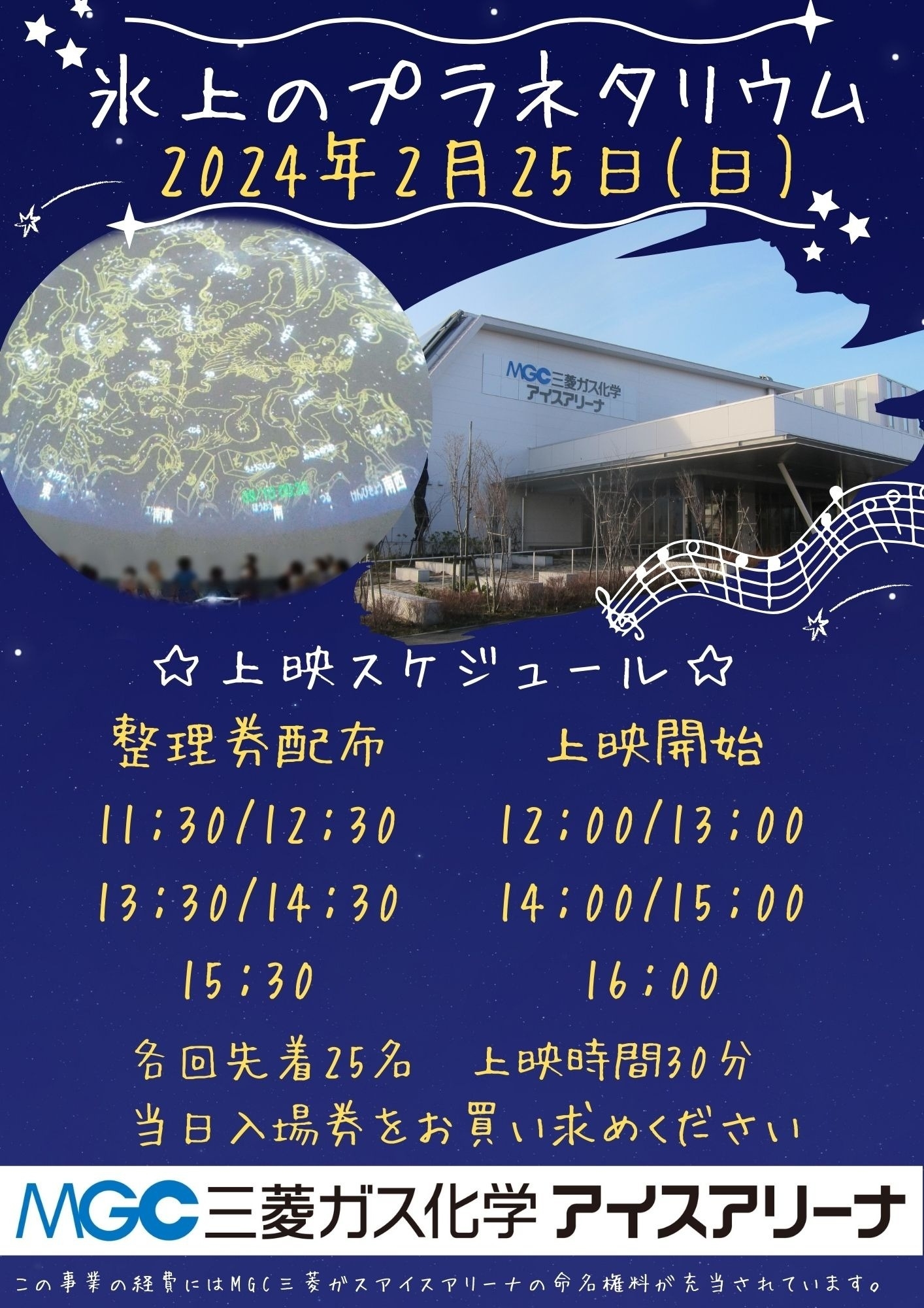 今年も開催!?氷上プラネタリウム 2024年02月02日(金) イベント 今年も開催!!「氷上のプラネタリウム」 2月25日(日)の氷上プラネタリウムを開催致します。 ドーム内に映し出された宇宙の姿は、みなさんを幻想空間へと誘います! スケートリンクで壮大な星空の世界をご体感ください! 皆さまのご来場、お待ちしております! ※当日はイベント開催の為、無料ワンポイントレッスンは休止となります。 ご了承ください。