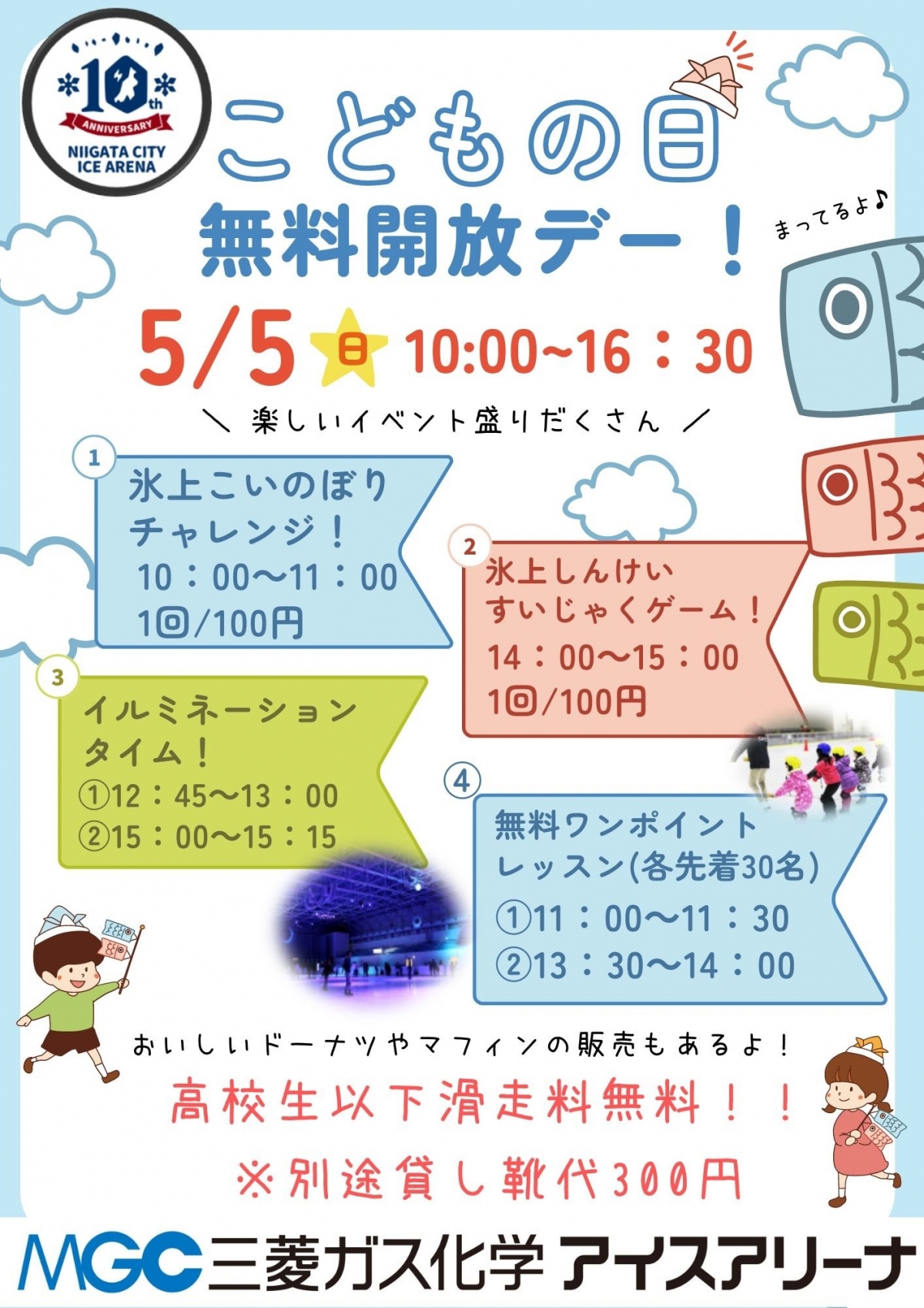 こどもの日 無料開放イベント!! 2024年04月21日(日) イベント 2024年5月5日(日)当施設では、高校生以下を対象に滑走料が無料になるこどもの日無料開放イベントを開催致します!! イベント当日はどなたでもご参加頂けるミニゲーム(1回100円)や無料ワンポイントレッスン、幻想的なリンクを演出するイルミネーションリンクなどイベント盛りだくさん!! 高校生以下のお客様は”無料”で滑走できちゃいます!!(貸靴利用の場合は別途300円) GWの思い出に是非、氷上スポーツをお楽しみください!!