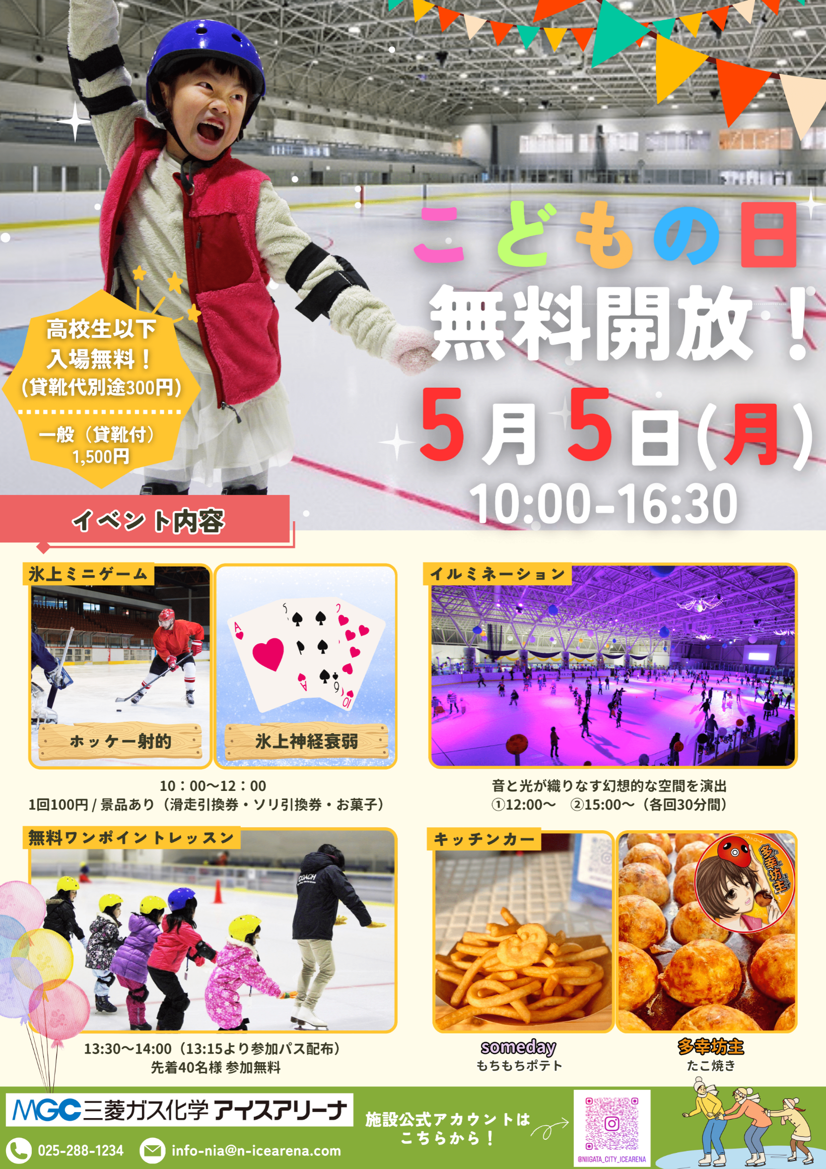 こどもの日 無料開放!!! 2025年04月18日(金) イベント 2025年5月5日(月祝)に高校生以下を対象に滑走料が無料になるこどもの日無料開放イベントを開催致します!! イベント当日はどなたでもご参加頂けるミニゲーム(1回100円)や無料ワンポイントレッスン、幻想的なリンクを演出するイルミネーションリンクなどイベント盛りだくさん!! 高校生以下のお客様は”無料”で滑走できちゃいます!!(貸靴利用の場合は別途300円) GWの思い出に是非、氷上スポーツをお楽しみください!!
