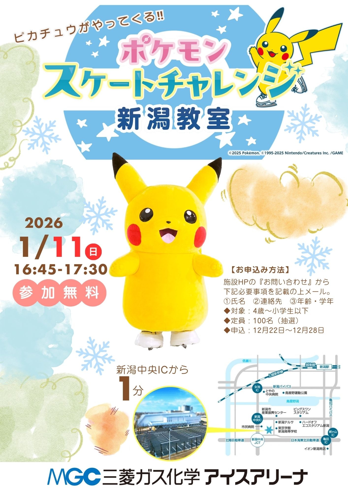 ポケモンスケートチャレンジ 新潟教室 2025年12月20日(土) イベント NEW 日程:2026年1月11日(日) 時間:16:45~17:30 料金:無料 持物:指先まで隠れる手袋・防寒着・長めの靴下 申込:12/22(月)~12/28(日)までに「なまえ・年齢・学年・電話番号」をお電話またはE-mailにてお知らせください 対象:4歳~小学6年生まで 100名(応募多数の場合は抽選)