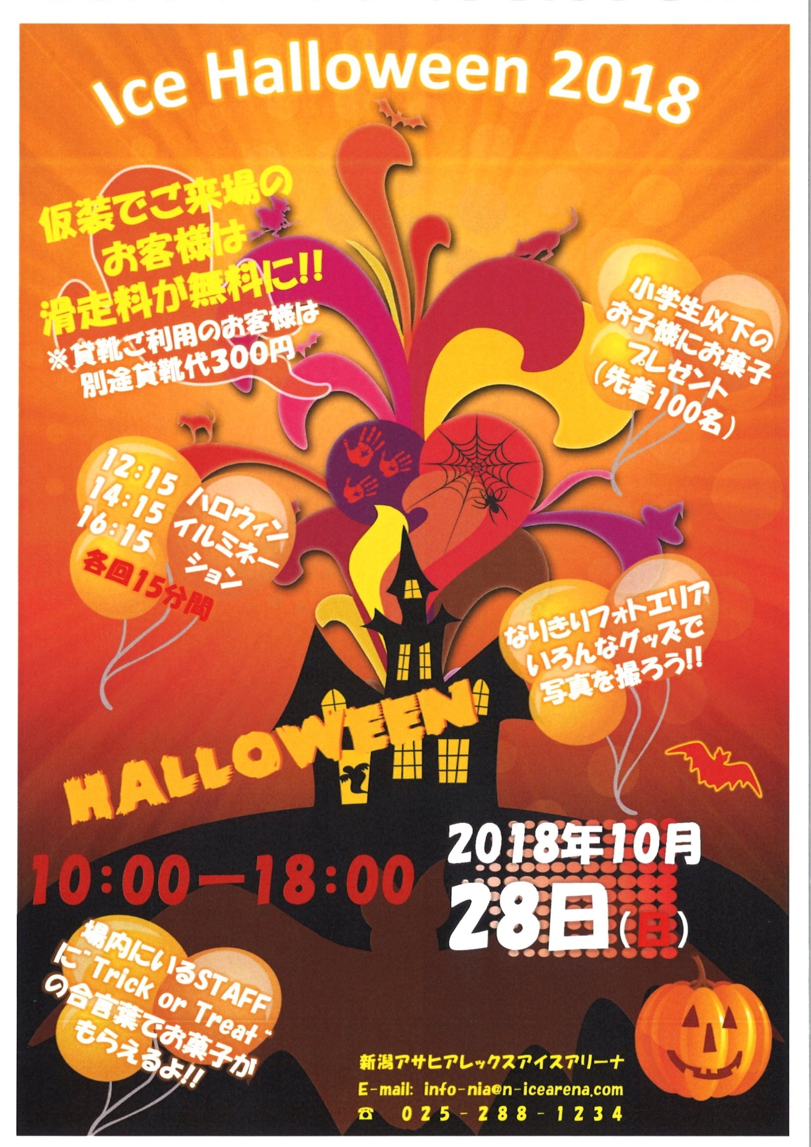 Ice Halloween 2018 2018年10月17日(水) イベント 10月28日(日)にハロウィンイベントを開催致します!! 仮装をしてご来場のお客様は滑走料が無料に、その他ハロウィンイルミネーションや小学生以下のお子様先着100名を対象にお菓子の詰め合わせのプレゼントなどイベント盛りだくさんとなっております!! 当日はスタッフも仮装をしてお待ちしておりますので、是非一緒にスケートを楽しみましょう!!